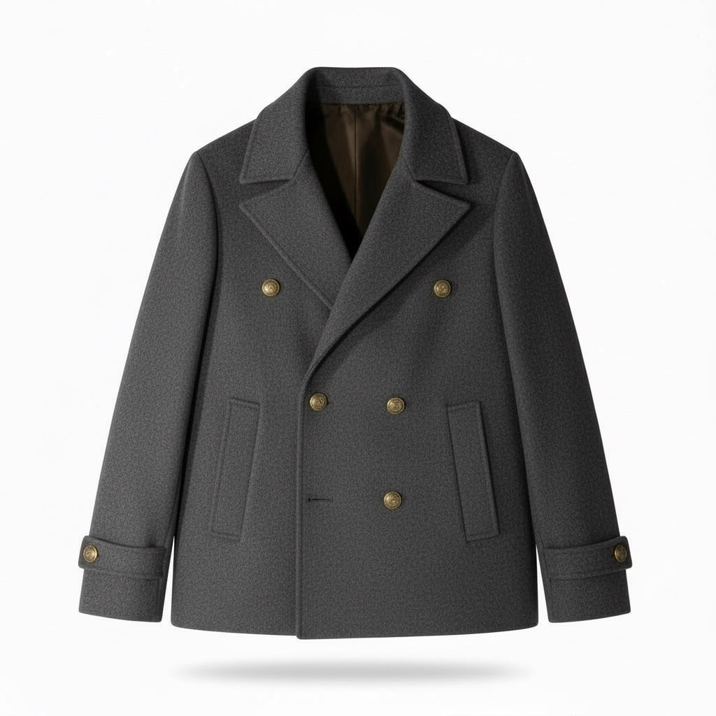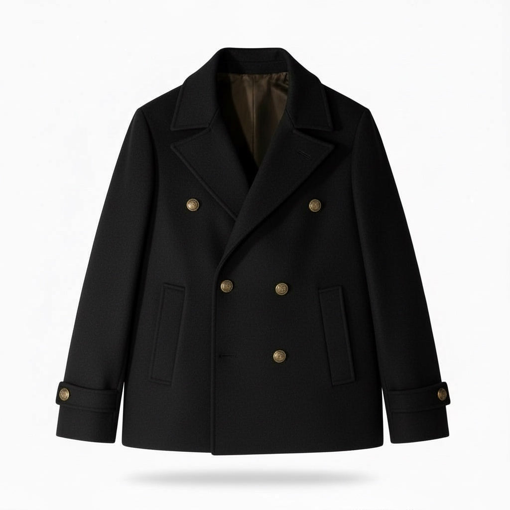 Cappotto doppio petto in panno con bottoni in acciaio a contrasto e polsini sulle maniche . Codice SKU: TSH-BLK-F65: