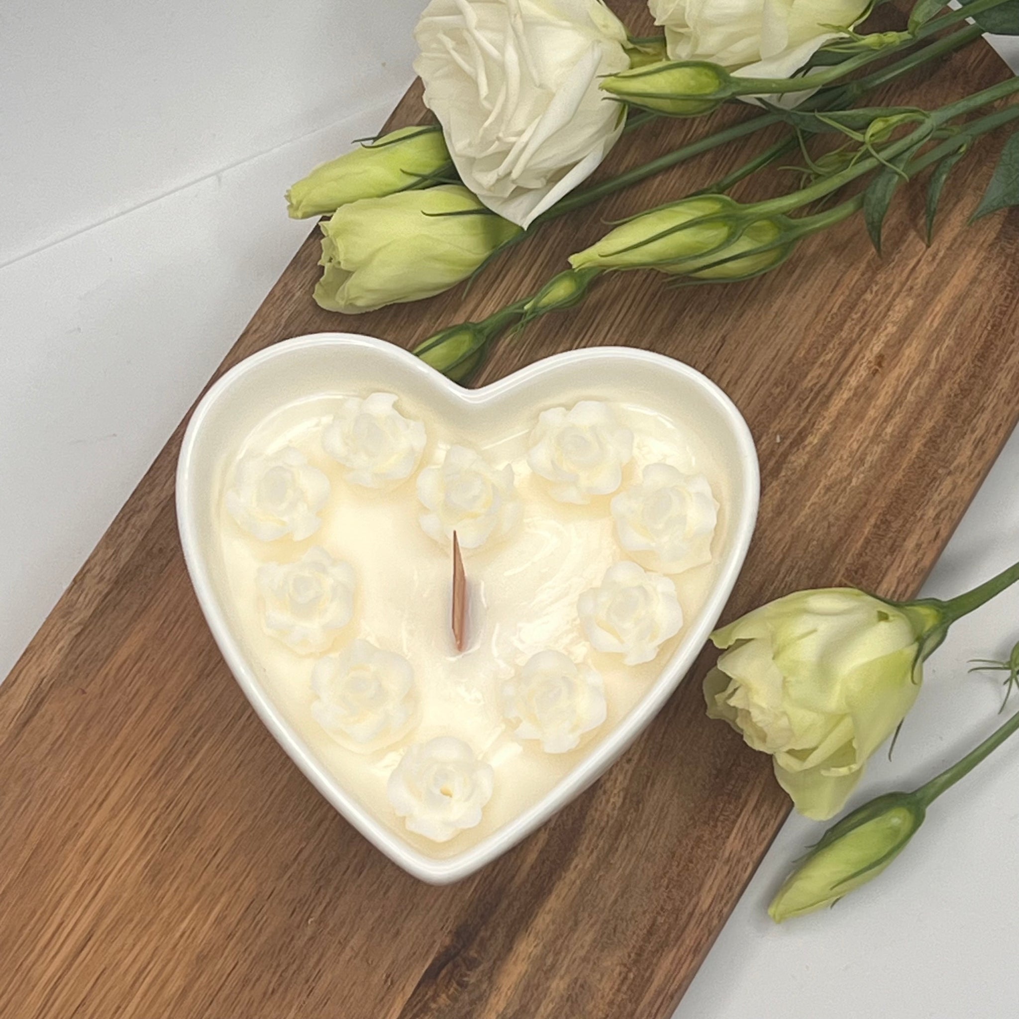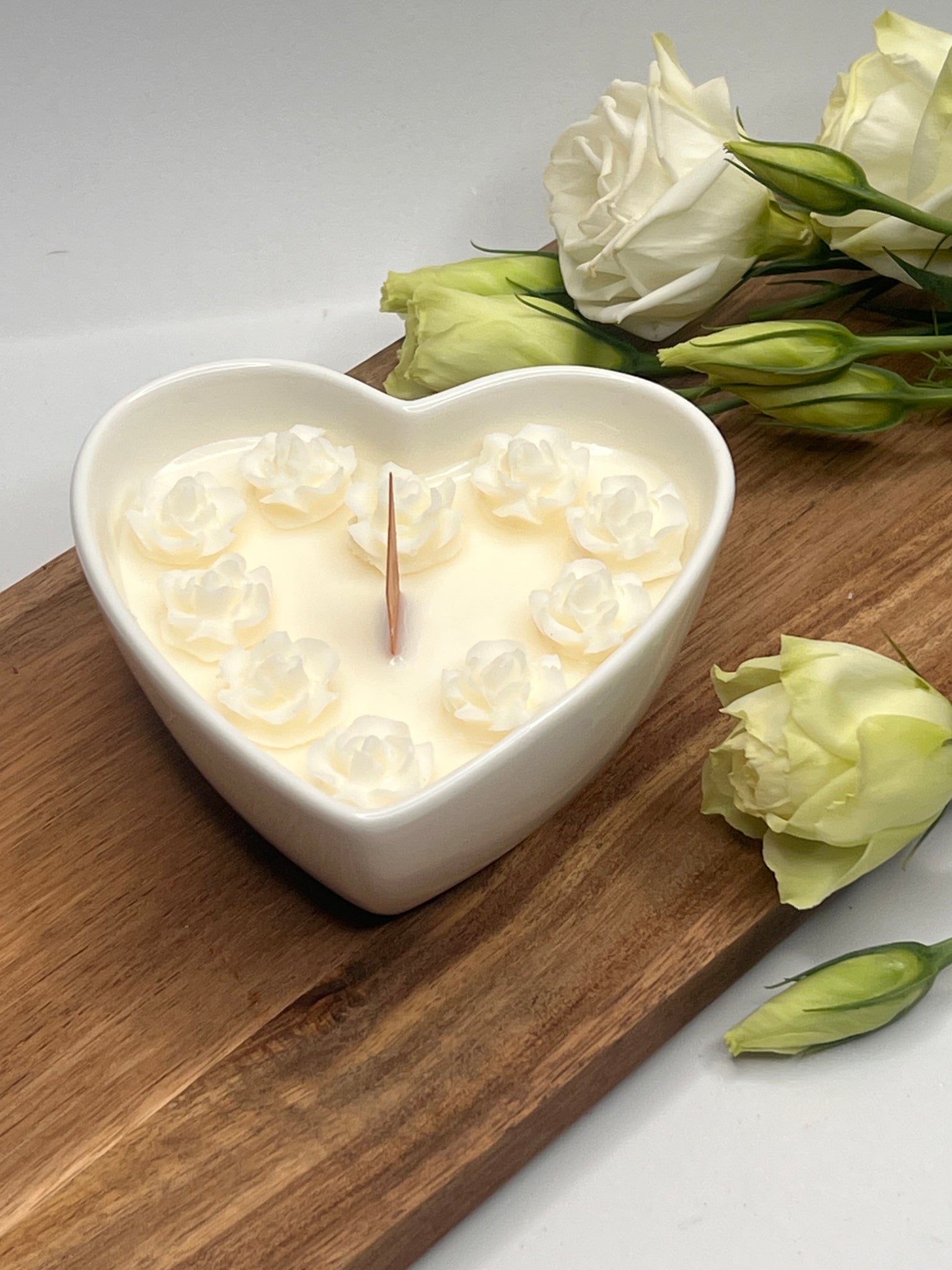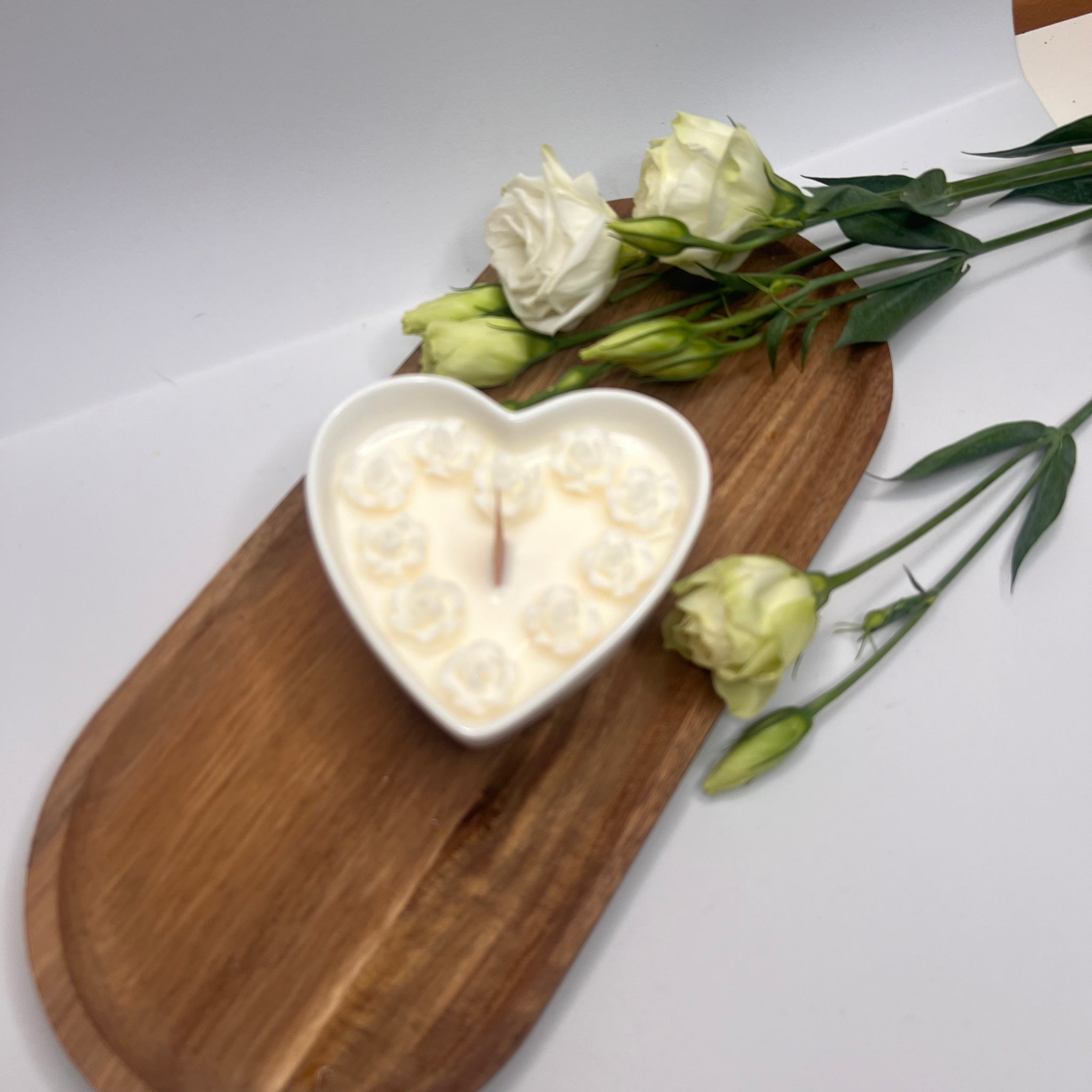 Un vassoio di fine ceramica a forma di cuore ospita al suo interno delle minuscole roselline. Crea un'atmosfera di pura raffinatezza con il nostro esclusivo vassoio, realizzato a mano e decorato con una base di cera naturale. Ogni vaso è un'opera d'arte unica, che emanana una bellezza senza tempo. I dettagli floreali si intrecciano armoniosamente con piccoli boccioli di rosa, creando un raffinato equilibrio tra natura e romanticismo.