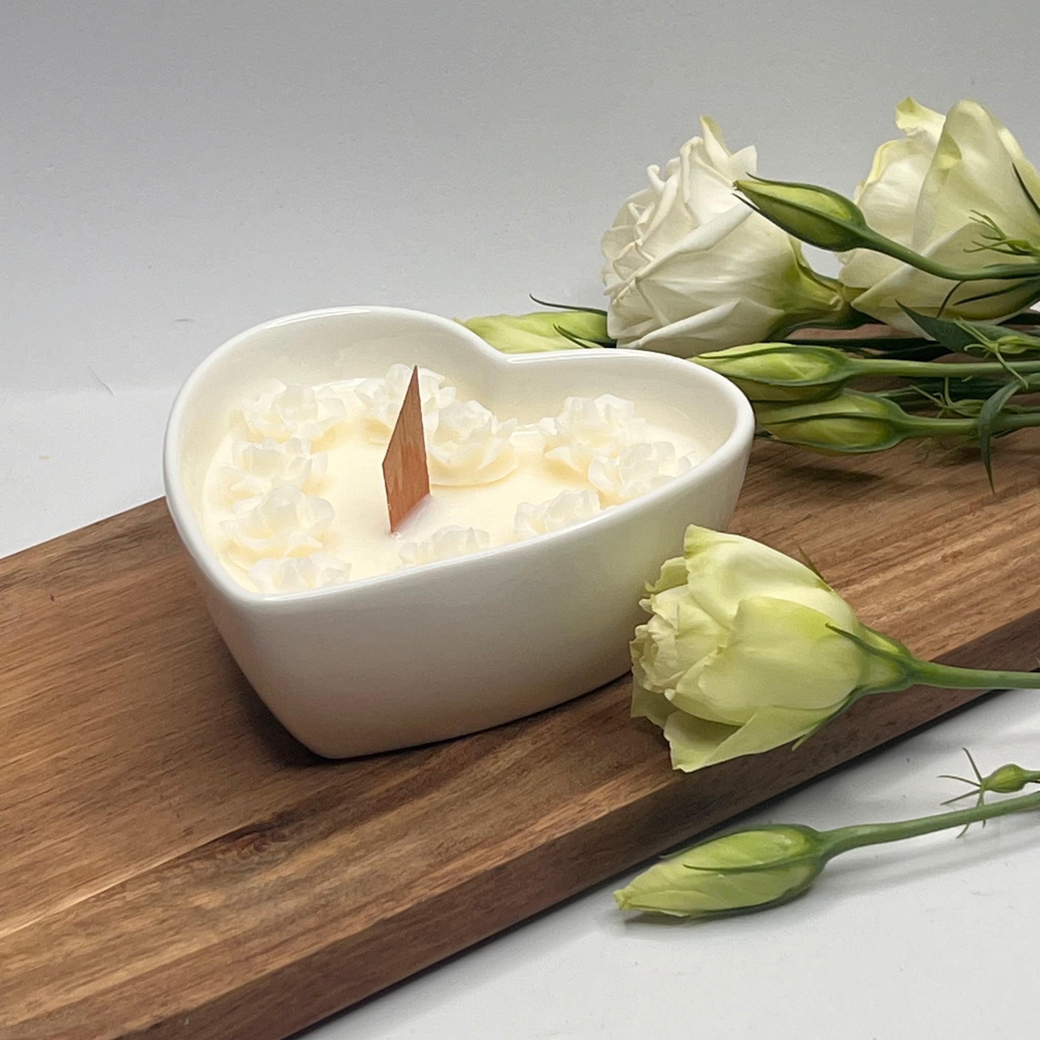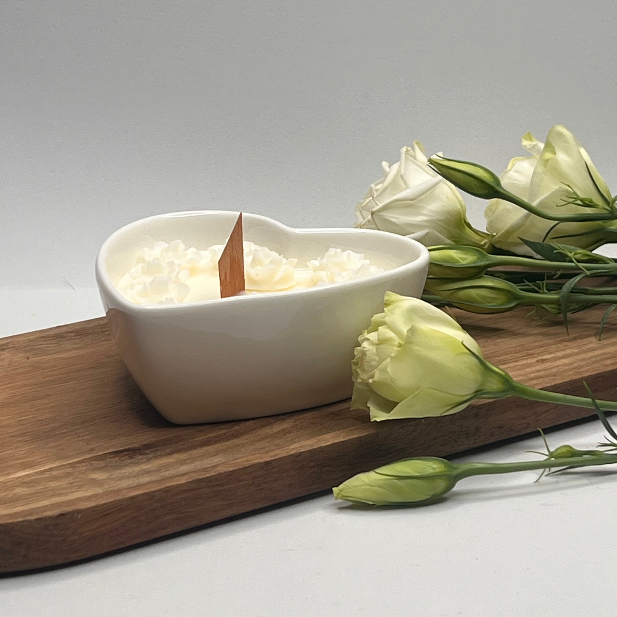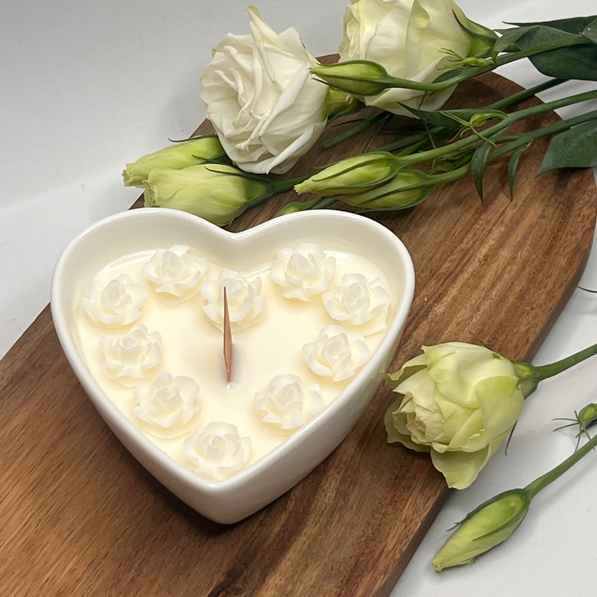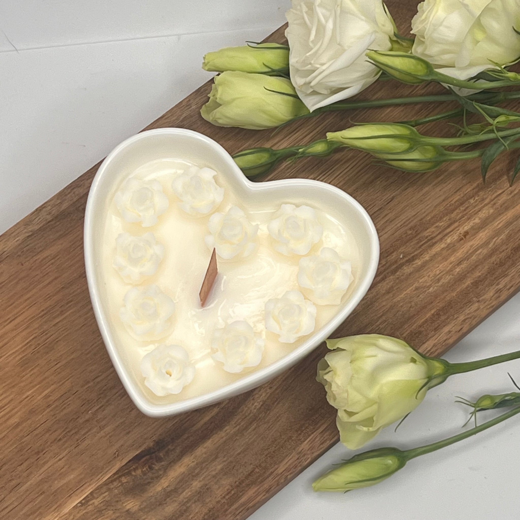 Un vassoio di fine ceramica a forma di cuore ospita al suo interno delle minuscole roselline. Crea un'atmosfera di pura raffinatezza con il nostro esclusivo vassoio, realizzato a mano e decorato con una base di cera naturale. Ogni vaso è un'opera d'arte unica, che emanana una bellezza senza tempo. I dettagli floreali si intrecciano armoniosamente con piccoli boccioli di rosa, creando un raffinato equilibrio tra natura e romanticismo.