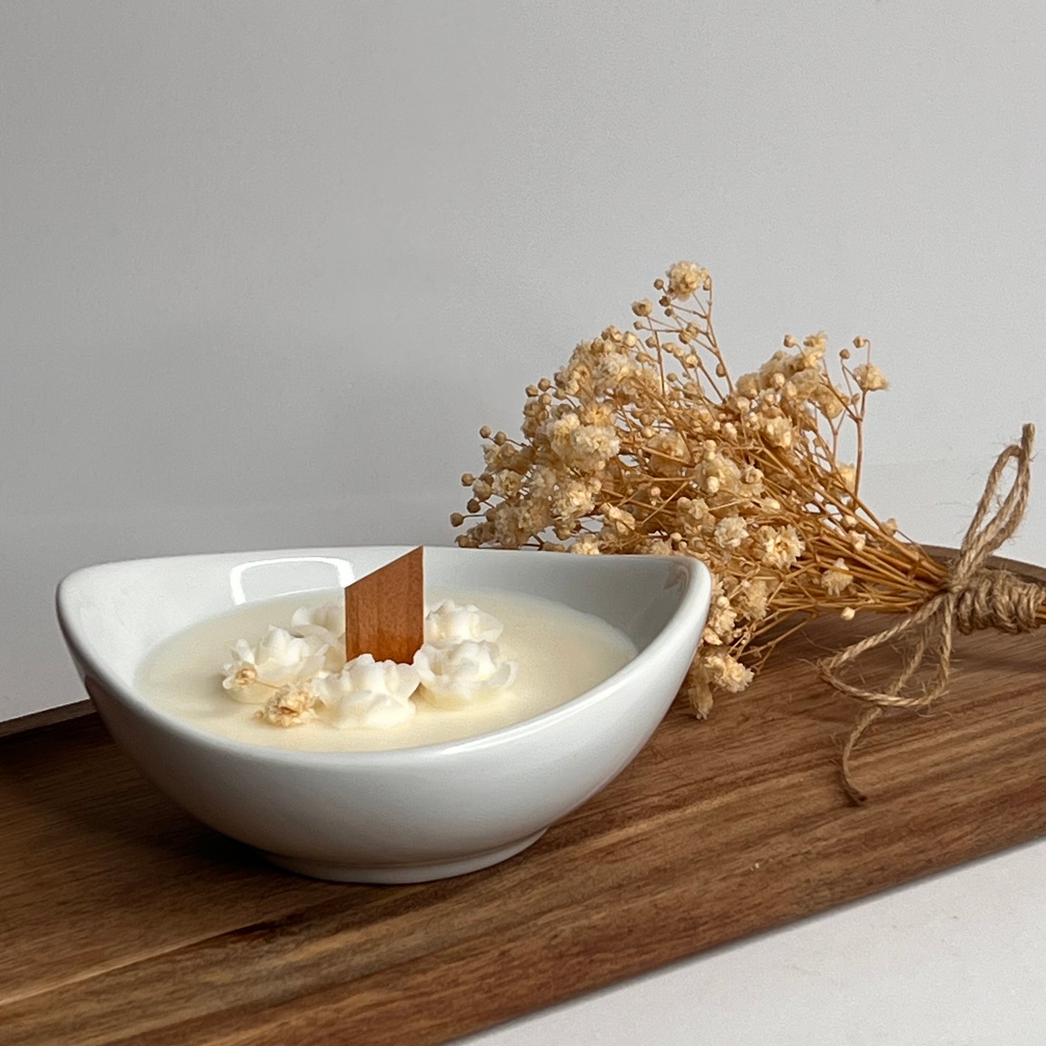 Materiali: Cera naturale, boccioli di rosa essiccati, vaso di cristallo.