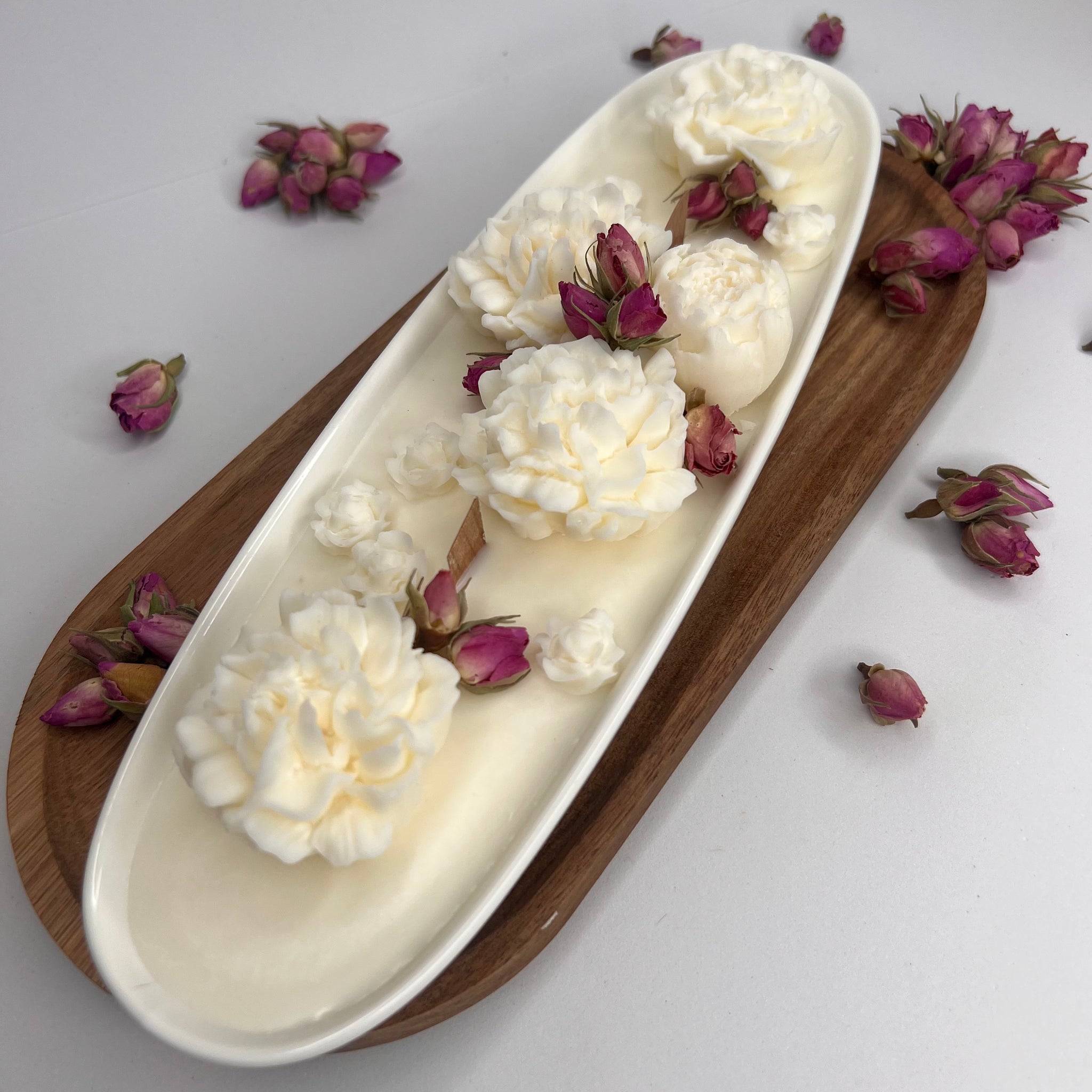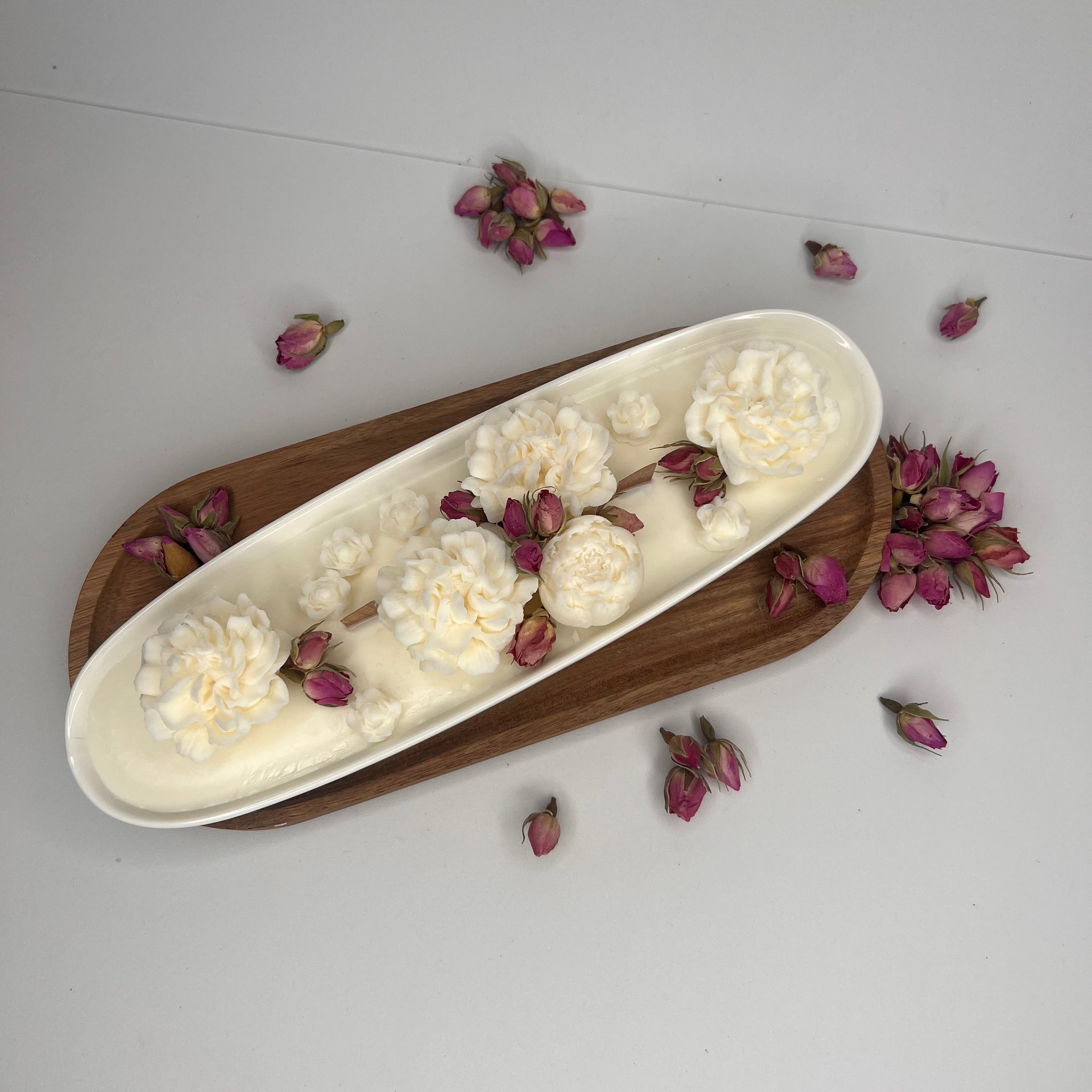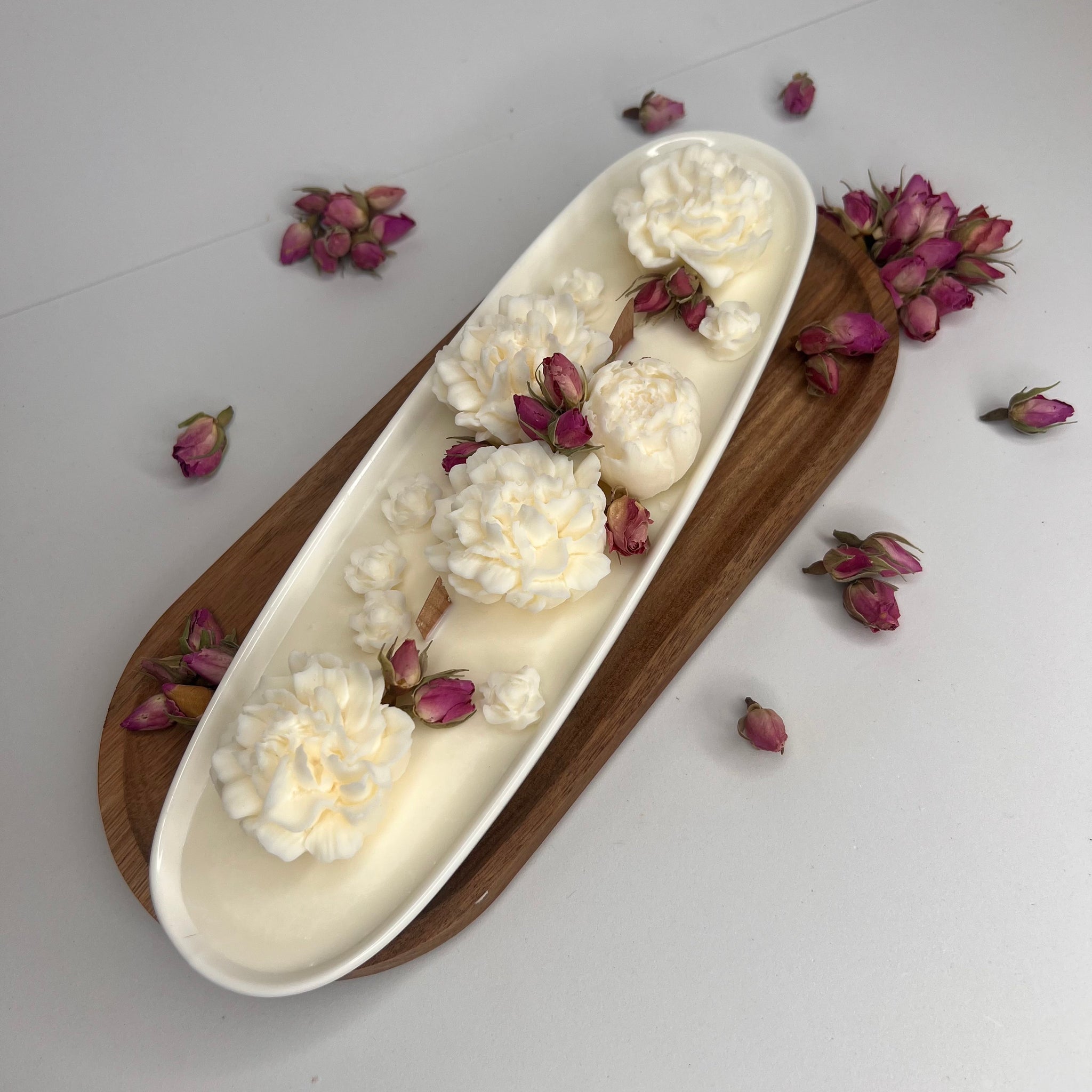 Un vassoio moderno di fine ceramica ospita al suo interno delle rose di cera naturale l'opera è arricchita di fiori secchi. Crea un'atmosfera di pura raffinatezza con il nostro esclusivo vassoio, realizzato a mano e decorato con una base di cera naturale. Ogni vassoio è un'opera d'arte unica, che emanana una bellezza senza tempo. I dettagli floreali si intrecciano armoniosamente con piccoli boccioli di rosa, creando un raffinato equilibrio tra natura e romanticismo.