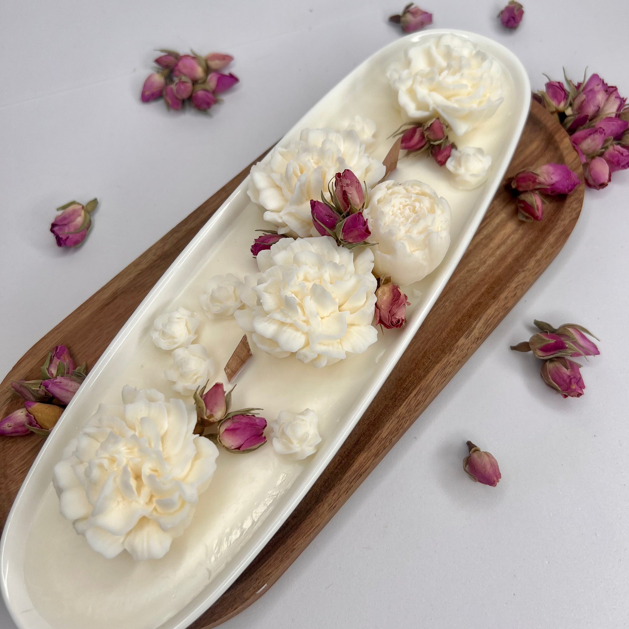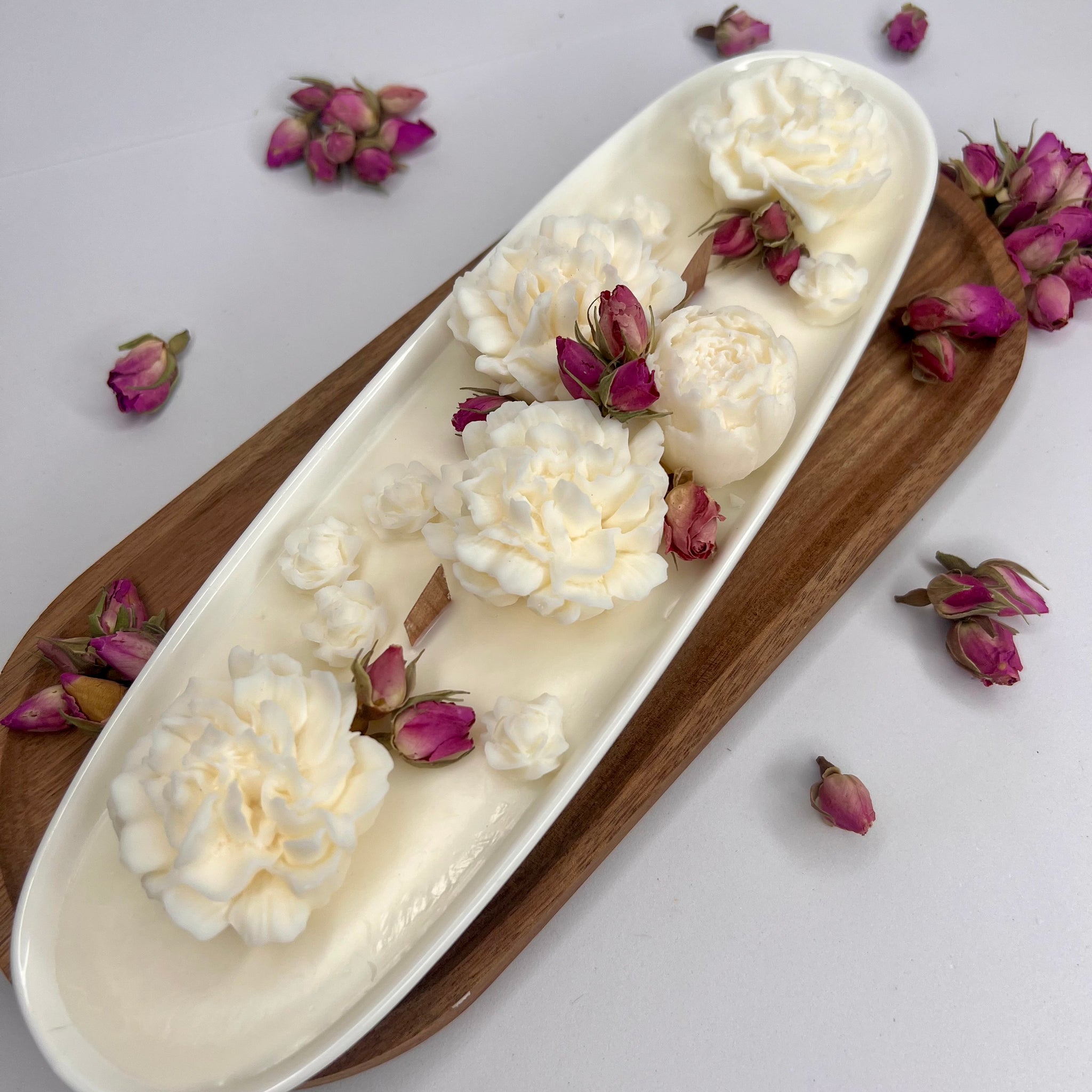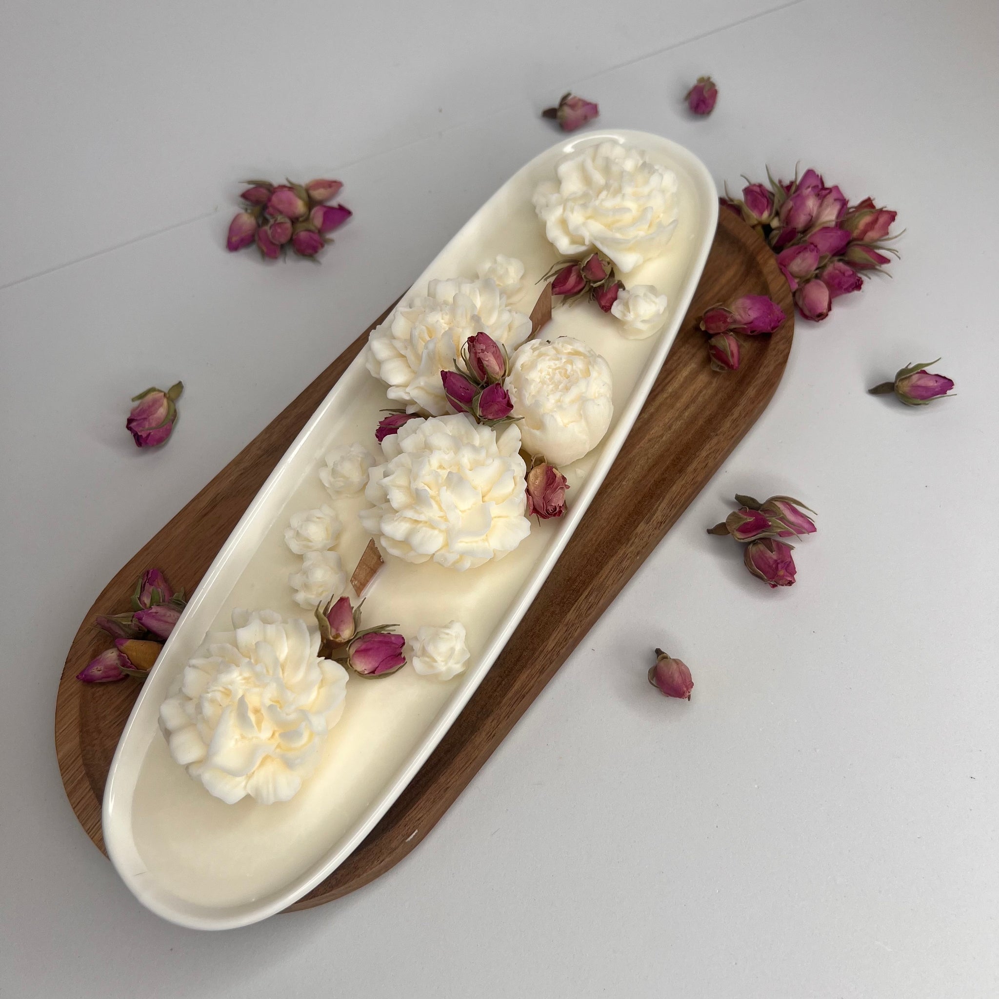 Un vassoio moderno di fine ceramica ospita al suo interno delle rose di cera naturale l'opera è arricchita di fiori secchi. Crea un'atmosfera di pura raffinatezza con il nostro esclusivo vassoio, realizzato a mano e decorato con una base di cera naturale. Ogni vassoio è un'opera d'arte unica, che emanana una bellezza senza tempo. I dettagli floreali si intrecciano armoniosamente con piccoli boccioli di rosa, creando un raffinato equilibrio tra natura e romanticismo.